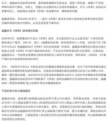202204-18近日,盛趣游戏连发两份声明,宣称娱美德授权无效违法,侵害了其权益,细看之下发现,声明内容并不真实。实际上,依据众多法院判决以及相关仲裁裁决,作为《传奇》游戏的共...